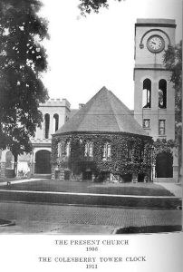 HCCC has occupied four buildings during its history. Community settlers first met in the log cabin of one of its members. As the church and the community grew, HCCC occupied a crude frame structure on the site of the present county jail and courthouse on Park Avenue West. Later, the church occupied a brick building with a tall spire on the present site. In the early 1900’s, church members found the basement under the building had weaken the foundation, and members decided to rebuild the church. Church members erected the present building in 1906, with its addition for Christian Education and Fellowship rooms added in 1956. The high tower with its chiming clock, which has distinguished the building over the years, was the gift of Minnie Colesbury in 1911.